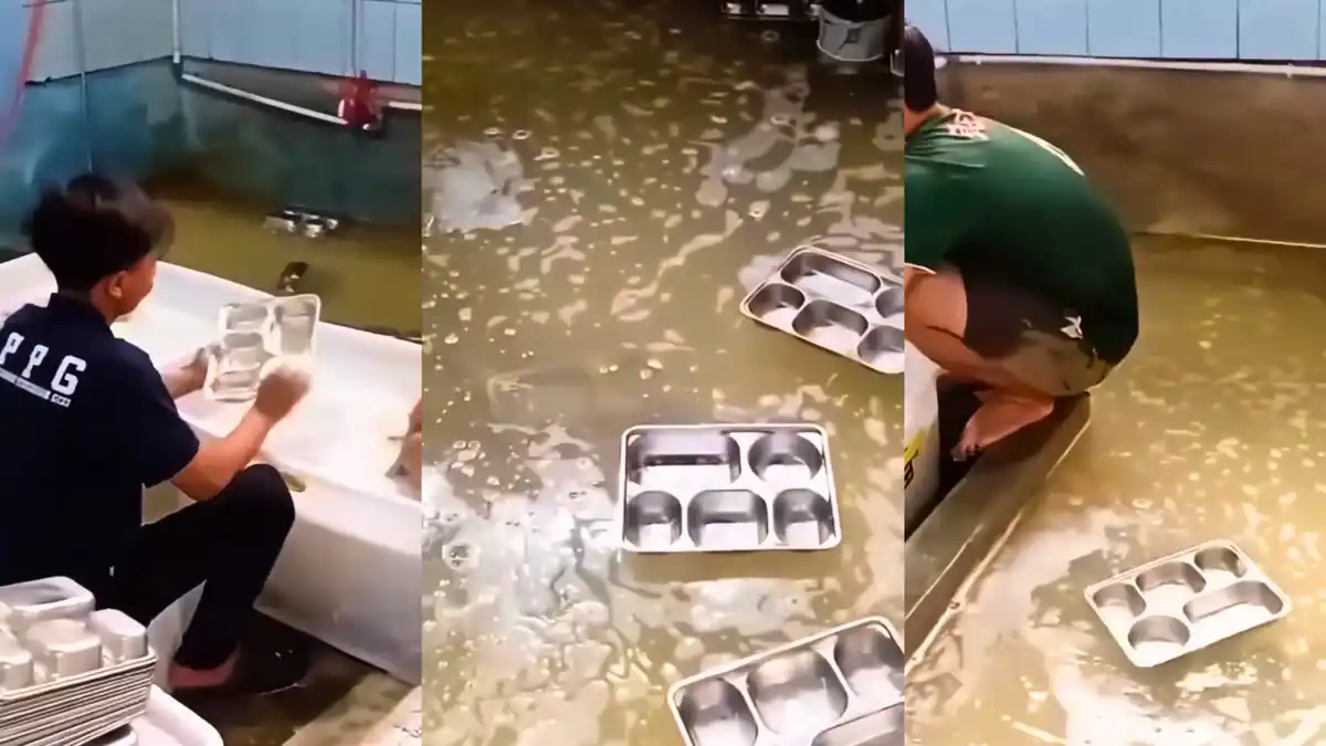 Dalam rekaman berdurasi sekitar 30 detik, dua pekerja terlihat menggosok nampan di bak berisi air sabun lalu membilasnya dengan melempar ke genangan air yang tidak mengalir.