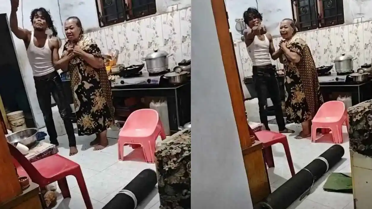 Rekaman yang beredar di media sosial memperlihatkan seorang pria memegang senjata tajam saat berada dekat seorang perempuan lanjut usia di area dapur.